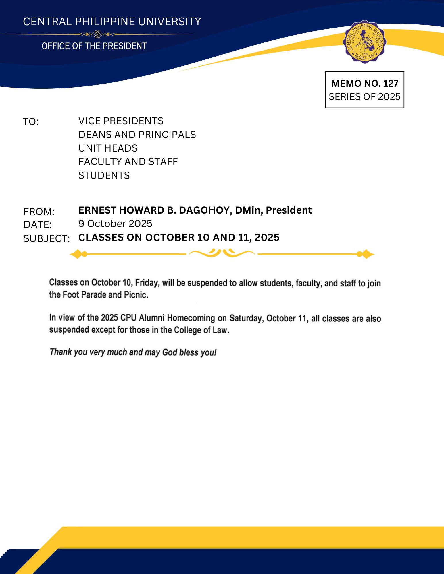 Memo No. 127- CLASSES ON OCTOBER 10 AND 11, 2025 by Central Philippine University | Oct 9, 2025 | announcements