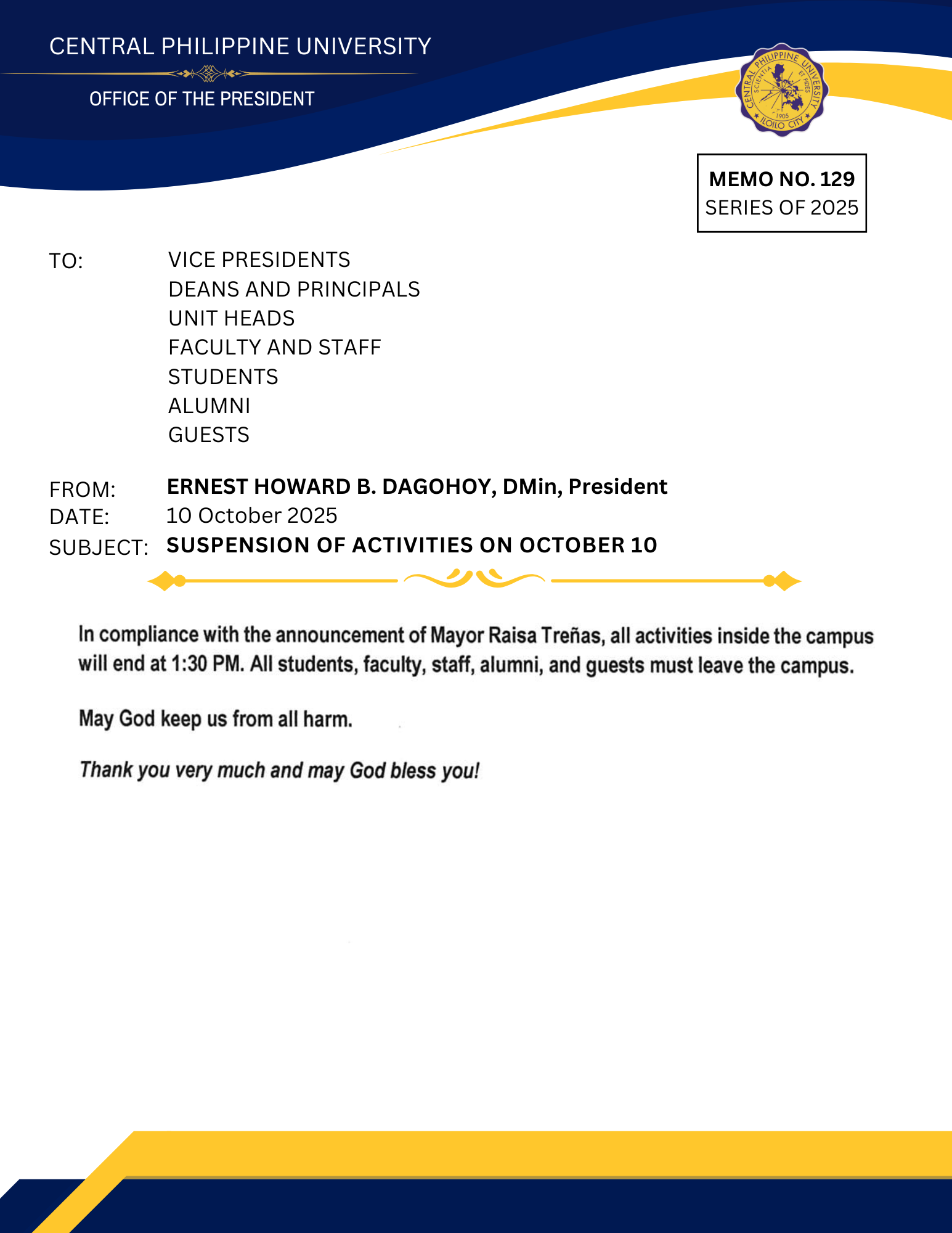Memo No. 129- SUSPENSION OF ACTIVITIES ON OCTOBER 10 by Central Philippine University | Oct 10, 2025 | announcements