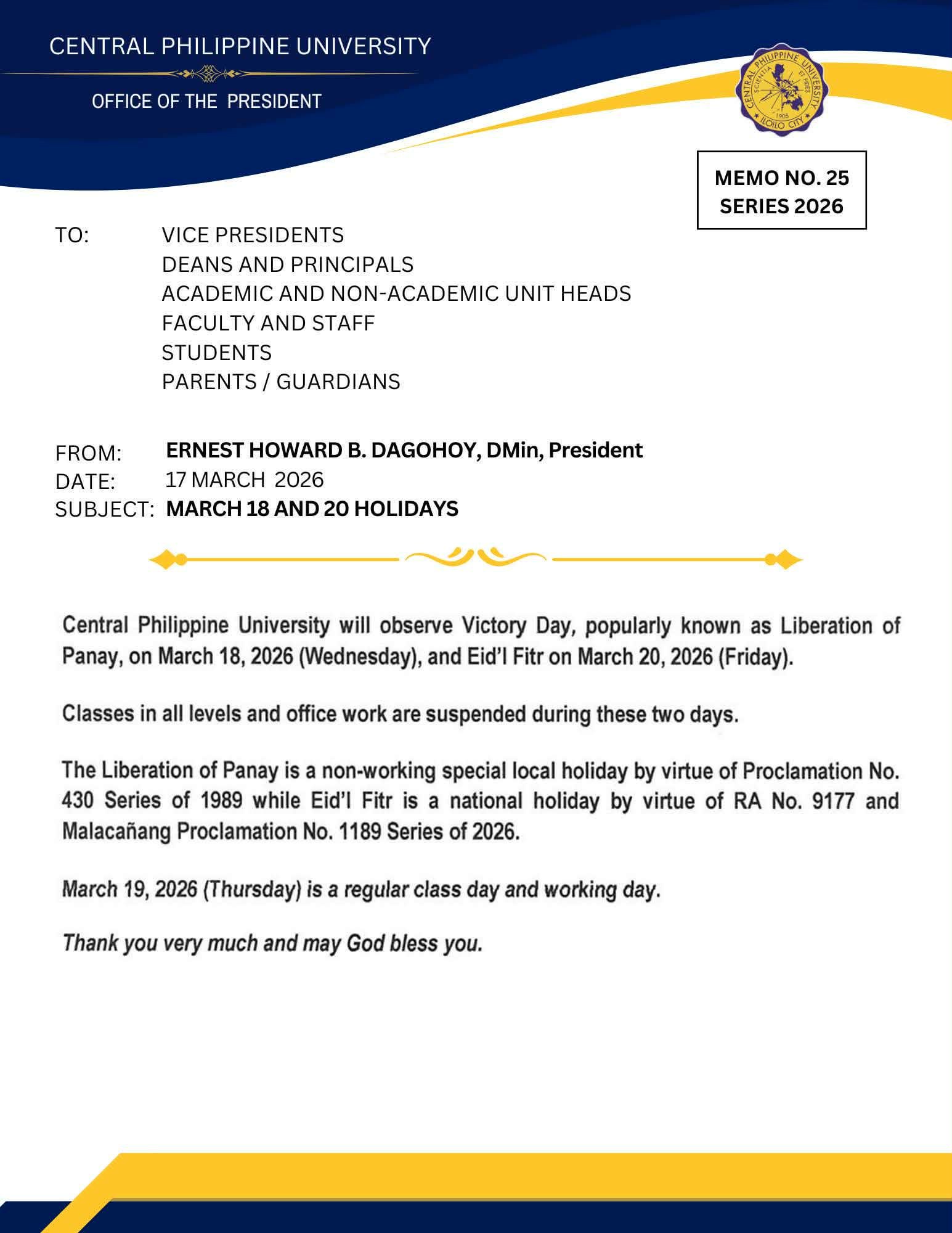 Memo No. 25 Series 2026 – March 18 and 20 Holidays by Central Philippine University | Mar 17, 2026 | announcements