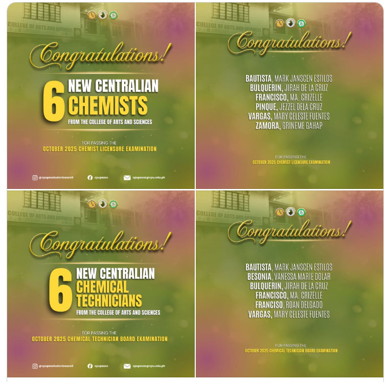 CPU President Rev. Dr. Ernest Howard B. Dagohoy extended his congratulations to the successful examinees, saying, “Congratulations, New Centralian Chemists and Chemical Technicians! To God be the glory!”