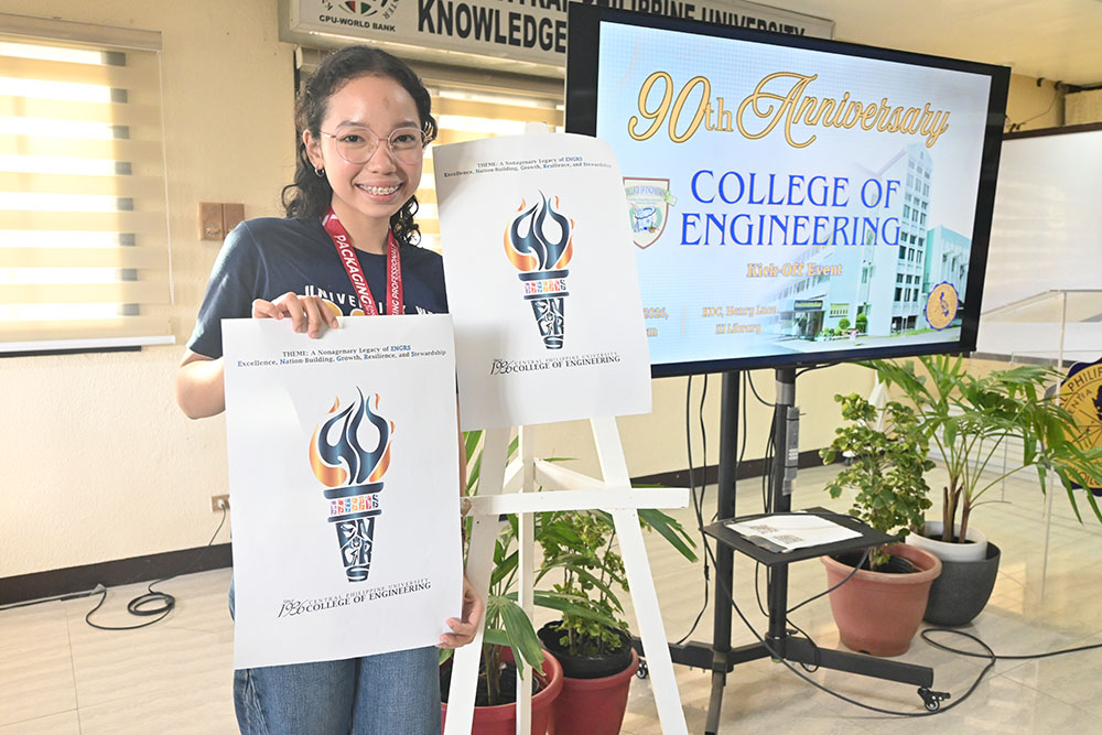 Nessa Joy Calantoc, BS PckEng 2, poses with her winning design for the official logo College of Engineering’s 90th Anniversary Celebration.