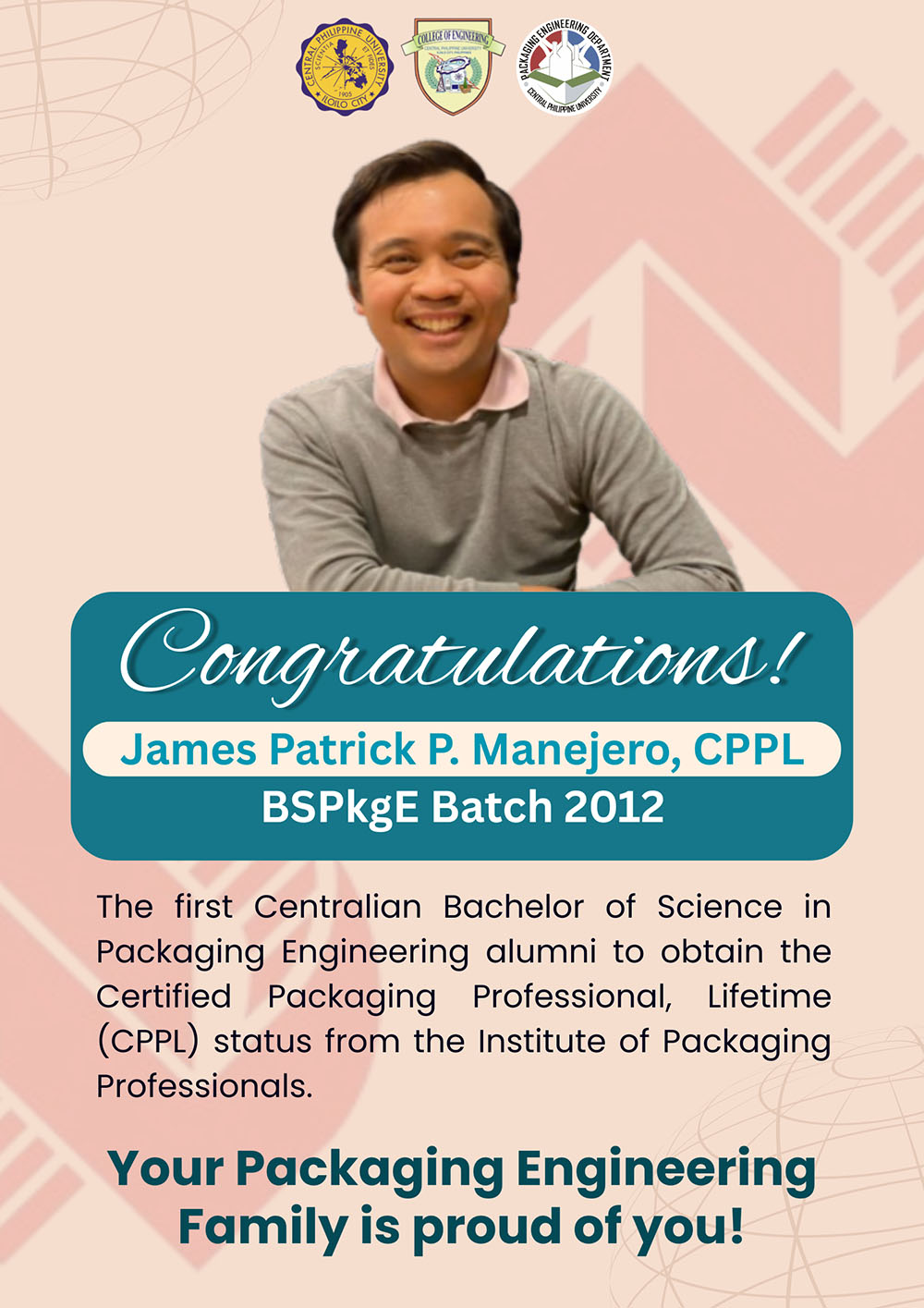 James Patrick P. Manejero, CPPL, a graduate in Bachelor of Science in Packaging Engineering, received the Certified Packaging Professional, Lifetime (CPPL) status from the Institute of Packaging Professionals (IoPP).
