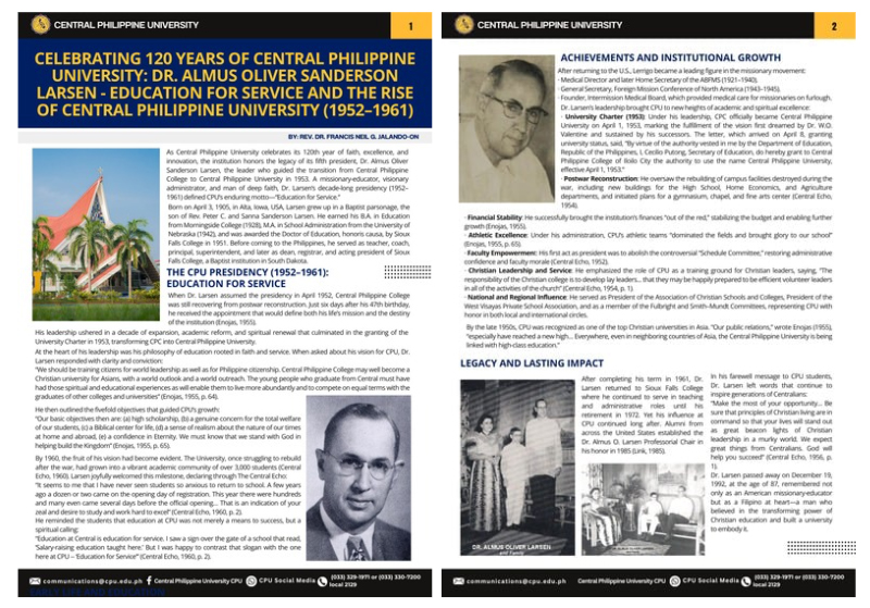 As Central Philippine University celebrates its 120th year of faith, excellence, and innovation, the institution honors the legacy of its fifth president, Dr. Almus Oliver Sanderson Larsen, the leader who guided the transition from Central Philippine College to Central Philippine University in 1953. A missionary-educator, visionary administrator, and man of deep faith, Dr. Larsen’s decade-long presidency (1952–1961) defined CPU’s enduring motto—“Education for Service.”
