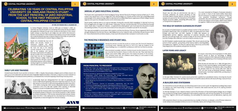 CPU marks its 120th year by honoring Dr. Harland Francis Stuart, the visionary leader who bridged the Jaro Industrial School and Central Philippine College, guiding the institution through growth, innovation, and faith.