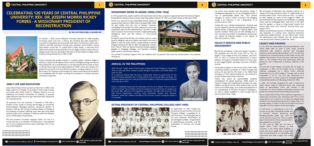 On October 1, 2025, Central Philippine University celebrated its 120th founding anniversary. Over more than a century, the University has been shaped by a succession of remarkable men and women both Filipino and American whose vision, resilience, and faith sustained it through wars, hardships, and transitions. Among these leaders stands Rev. Dr. Joseph Morris Rickey Forbes, a missionary from California whose life of service extended from the villages of Assam, India, to the war refugee camps of Burma, and finally to the halls of Central Philippine College, where he became Acting President from 1947 to 1950.
