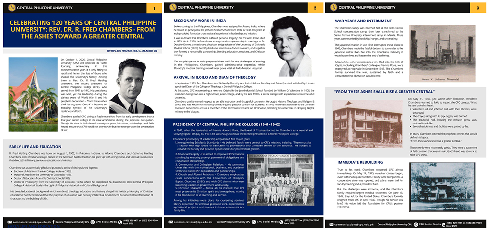 On October 1, 2025, Central Philippine University (CPU) will celebrate its 120th founding anniversary. In this commemorative year, it is only fitting to recall and honor the lives of those who shaped the university’s history. Among them is Rev. Dr. R. Fred Hertling Chambers, the second president of Central Philippine College (CPC), who served from 1941 to 1942. His presidency was brief, yet his leadership during the darkest years of World War II and his prophetic declaration — “From these ashes shall rise a greater Central” — became an enduring symbol of the university’s resilience and faith.