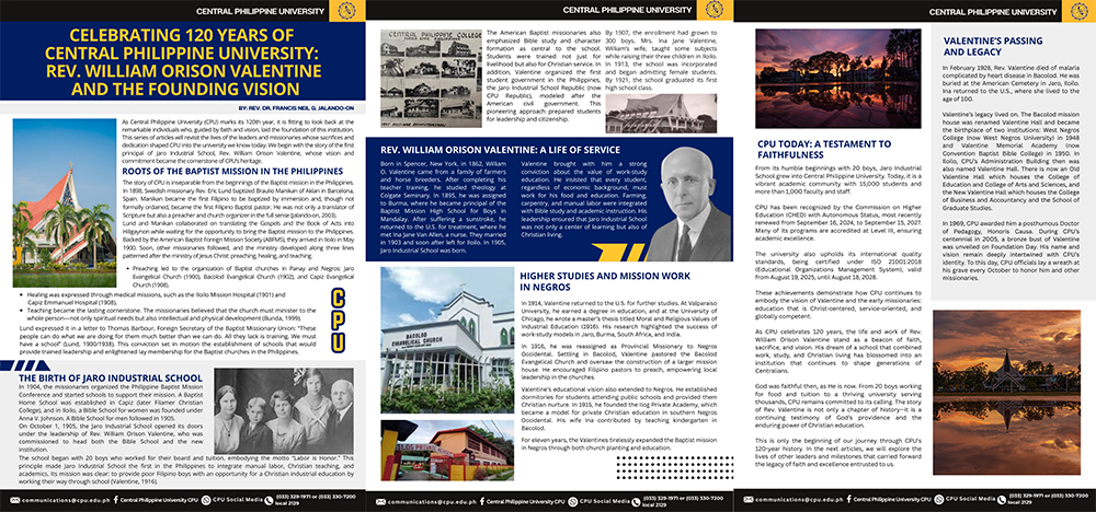 As Central Philippine University (CPU) marks its 120th year on October 1, 2025, it is fitting to look back at the remarkable individuals who, guided by faith and vision, laid the foundation of this institution. This series of articles will revisit the lives of the leaders and missionaries whose sacrifices and dedication shaped CPU into the university we know today. We begin with the story of the first principal of Jaro Industrial School, Rev. William Orison Valentine, whose vision and commitment became the cornerstone of CPU’s heritage.