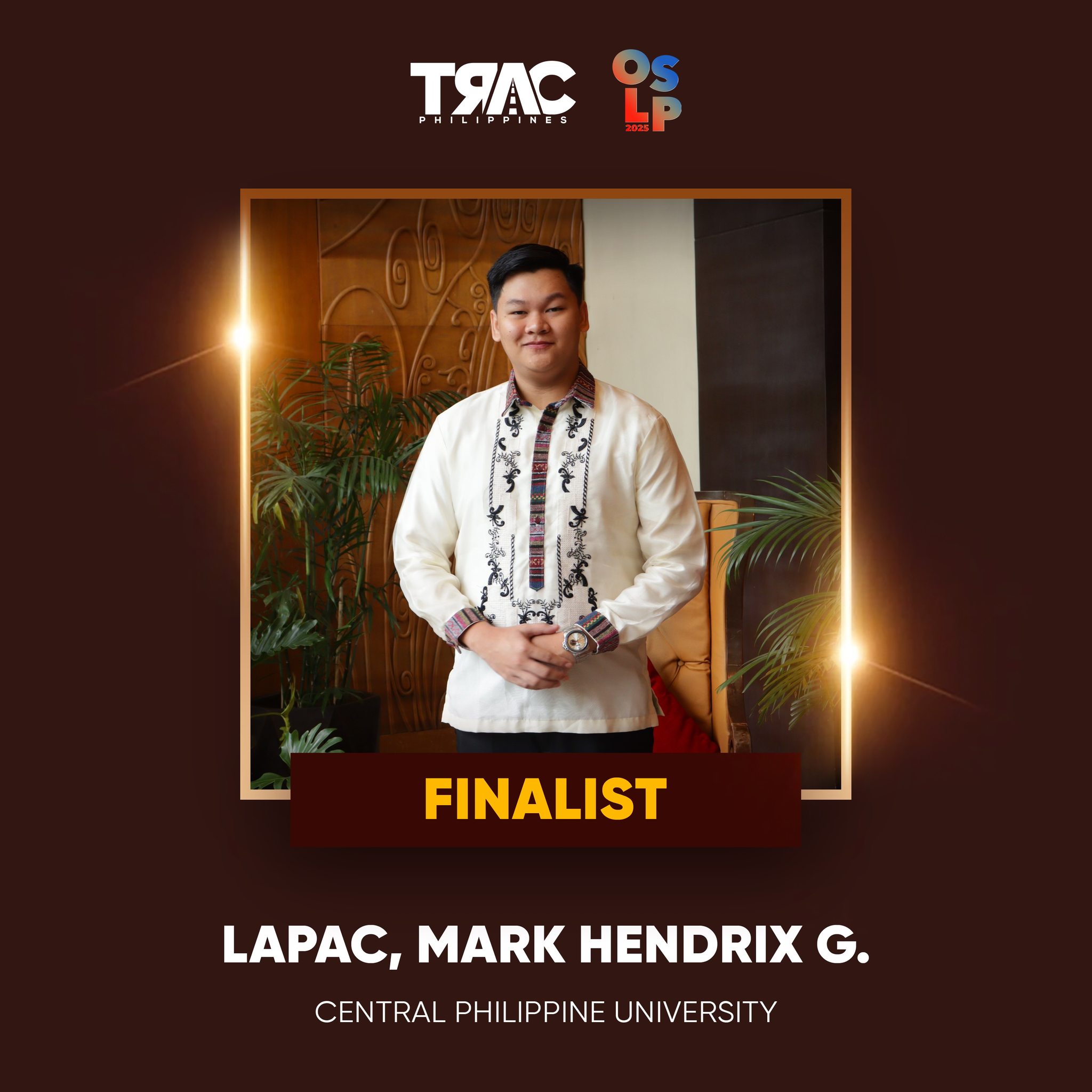 Mark Hendrix G. Lapac, a BS Biology specializing in Medical Biology student under the College of Arts and Sciences, is named one of the finalists in the 4th batch of the Outstanding Student Leaders of the Philippines (OSLP) for 2025.