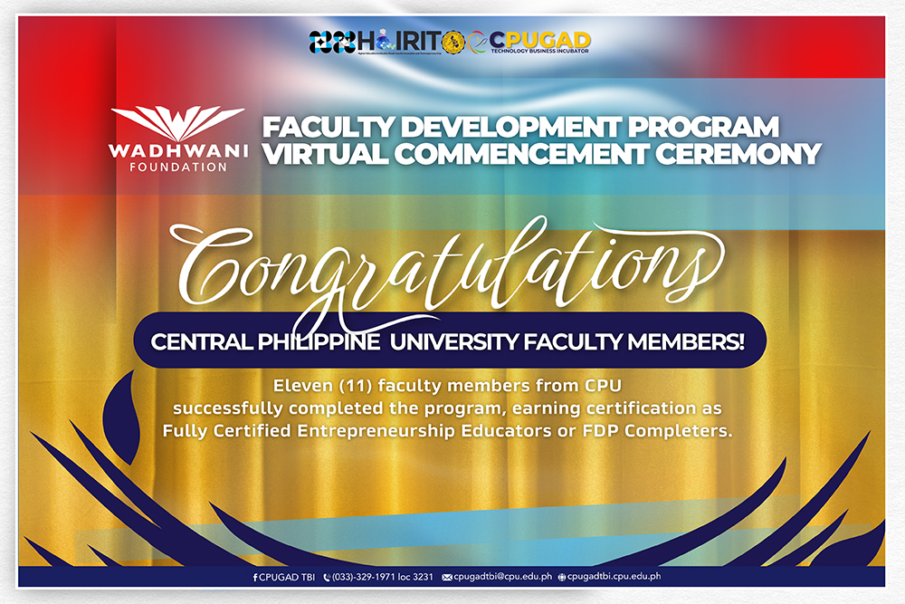 Following the successful in-person sessions of the Faculty Development Program (FDP) on Technopreneurship and Entrepreneurship Education held at CPU in September, eleven (11) faculty members from Central Philippine University (CPU) were recognized during the Wadhwani Foundation’s FDP Virtual Commencement Ceremony on October 17, 2025.