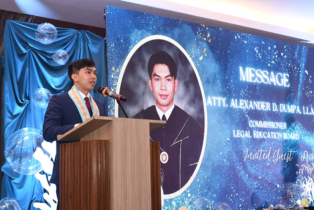 Atty. Alexander D. Dumpa, LL.M., Commissioner III representing the Law Students’ Sector of the Legal Education Board, delivered an insightful message emphasizing that law school is not only about memorizing provisions but about developing discipline, critical thinking, and character needed in the legal profession.