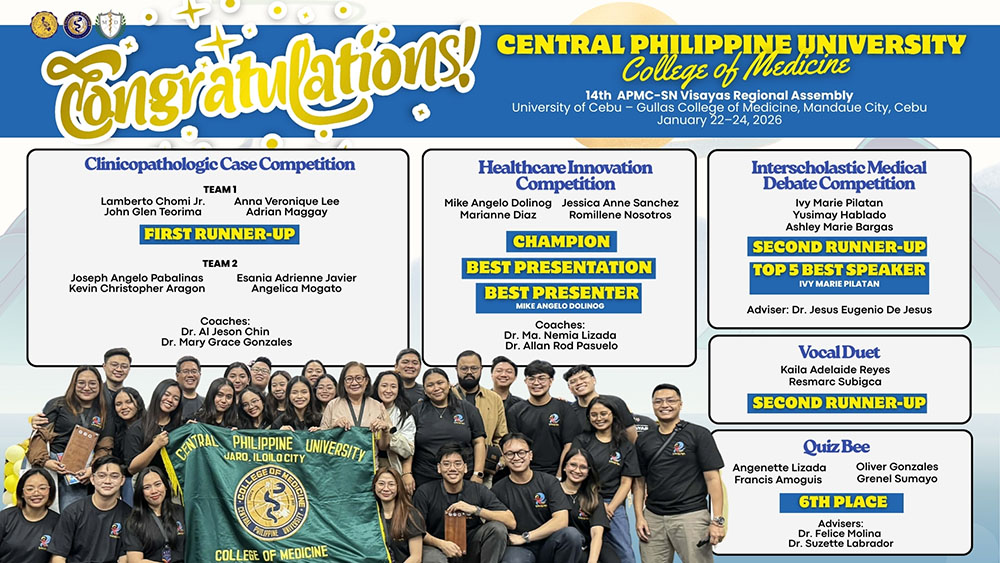The Central Philippine University College of Medicine (CPU ColMed) showcased academic excellence and competitive spirit at the 14th APMC-SN Visayas Regional Assembly held from January 22 to 24, 2026, at the University of Cebu – Gullas College of Medicine in Mandaue City, Cebu.