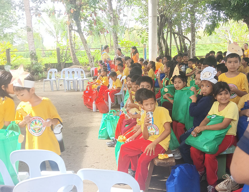 The learners of Badiang Elementary School (right) in their seats after the gift-giving portion of the outreach with the parents and faculty of the school during the Project L.E.A.P.: Lighting Every Aspiring Page.