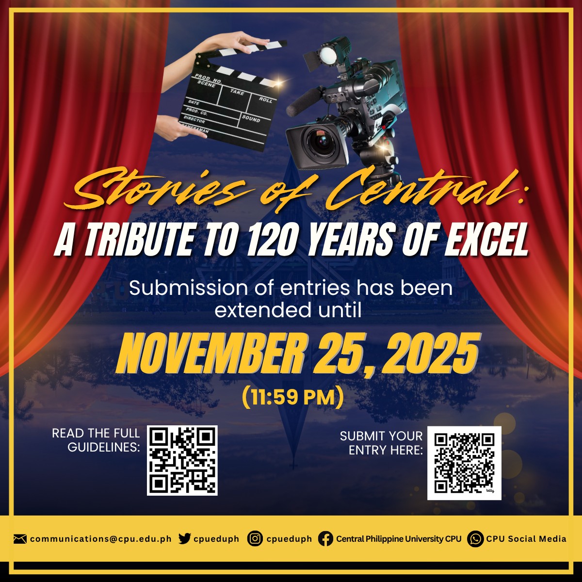Central Philippine University (CPU) extends the deadline for entries to Stories of Central: A Tribute to 120 Years of EXCEL until November 25, 2025, at 11:59 PM.
