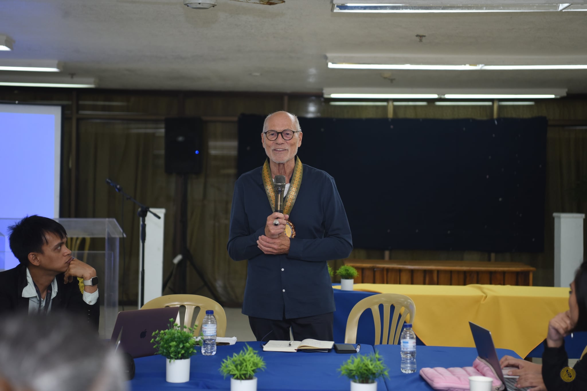 Guest speaker Dr. Thomas Bauer addresses participants during the seminars on “The Digital Nexus: Communication for Social Impact” and “Teaching Critical Media Literacy in the Age of Misinformation vis-à-vis Eco-Linguistics and Language for Sustainability,” held on November 26, 2025, at the Henry Luce III Library Conference Room.
