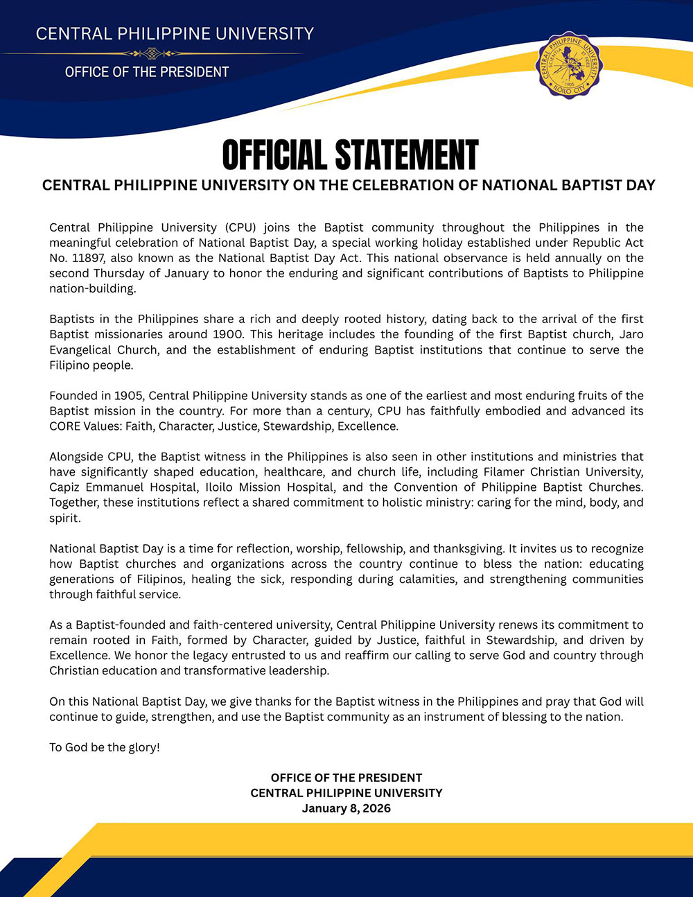 CPU celebrates National Baptist Day and reaffirms its commitment to faith and service in an official statement posted on its Facebook page yesterday, January 8, 2026.