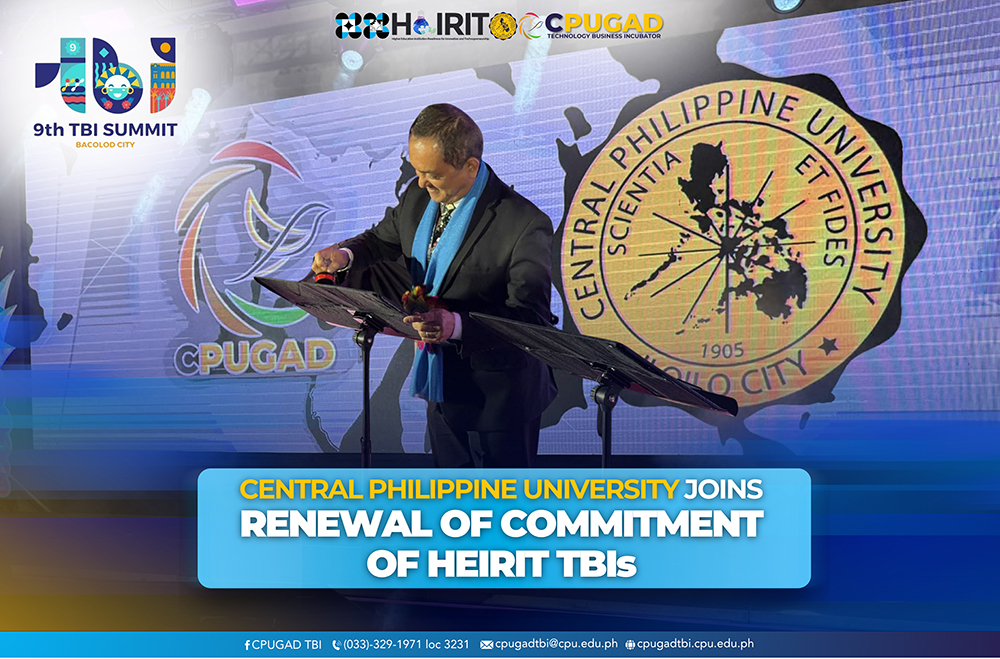 Central Philippine University (CPU), represented by President Rev. Dr. Ernest Howard B. Dagohoy, participated in the Renewal of Commitment for Higher Education Institution Readiness for Innovation and Technopreneurship (HEIRIT) Technology Business Incubators (TBIs), held during the 9th National TBI Summit at Citadines, Bacolod City on November 7, 2025.