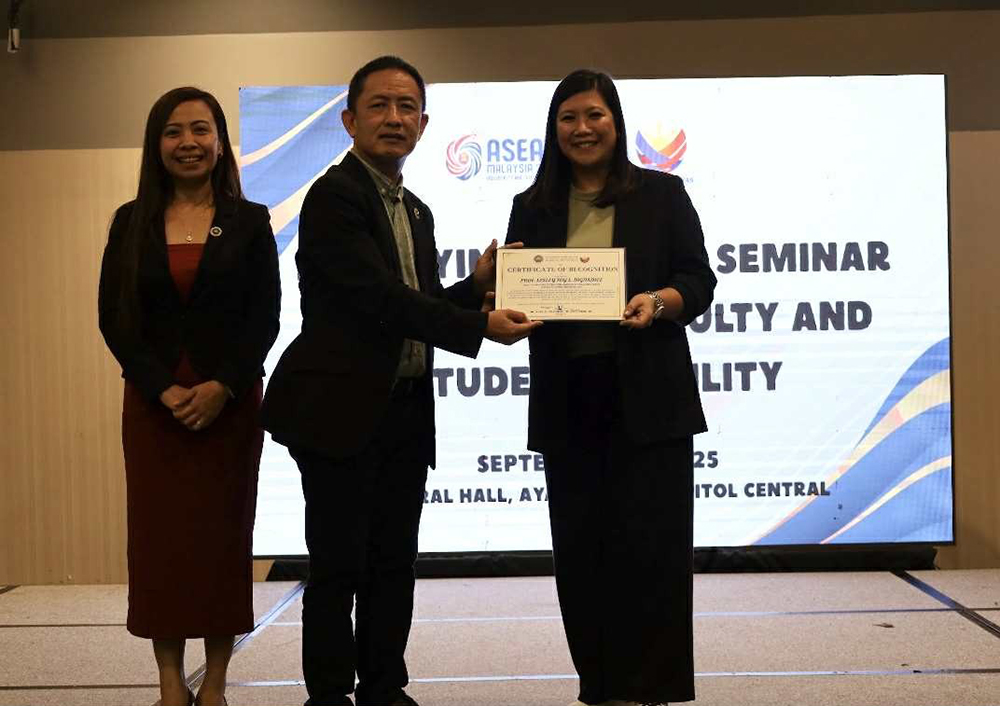 From right to left: Prof. Lesley Joy L. Dignadice receives her certificate of recognition for being a resource speaker during the “Fortifying Bridges: Seminar Series on Faculty and Student Mobility” organized by CHED Regional Office XVIII, held at the Function Hall of Ayala Malls Capitol Central in Bacolod City, along with Dr. Raul C. Alvarez, Jr., REE, CESO III; and Dr. Danebeth G. Narzoles, OIC Chief Education Program Specialist and IZN Focal Person of CHEDRO VI and XVIII.