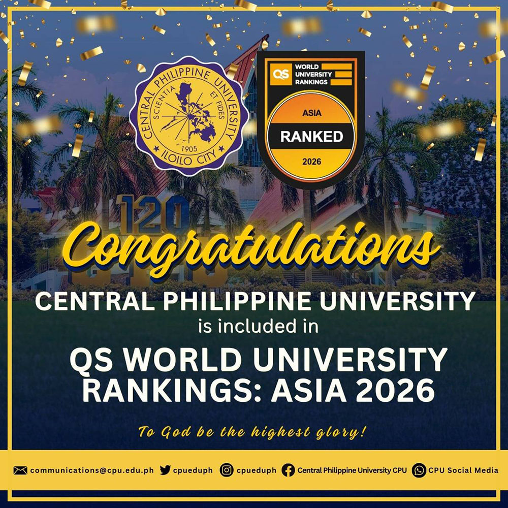 Central Philippine University continues to be recognized in the 2026 QS Asia University Rankings, placing first in Western Visayas, 22nd in the Philippines, 185th in Southeast Asia, and within the 1201–1300 range in Asia. To God be the highest glory!