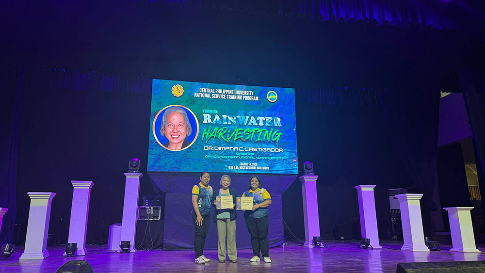 CPU NSTP Coordinator, Assoc. Prof. Annalie D. Gilongos (left), together with CPU NSTP-CWTS Coordinator Ma. Leen C. Gahum (right), pose for a photo after presenting a Certificate of Appreciation to the resource speaker, Dr. Dimpna C. Castigador (center), during her forum discussion on Rainwater Harvesting.