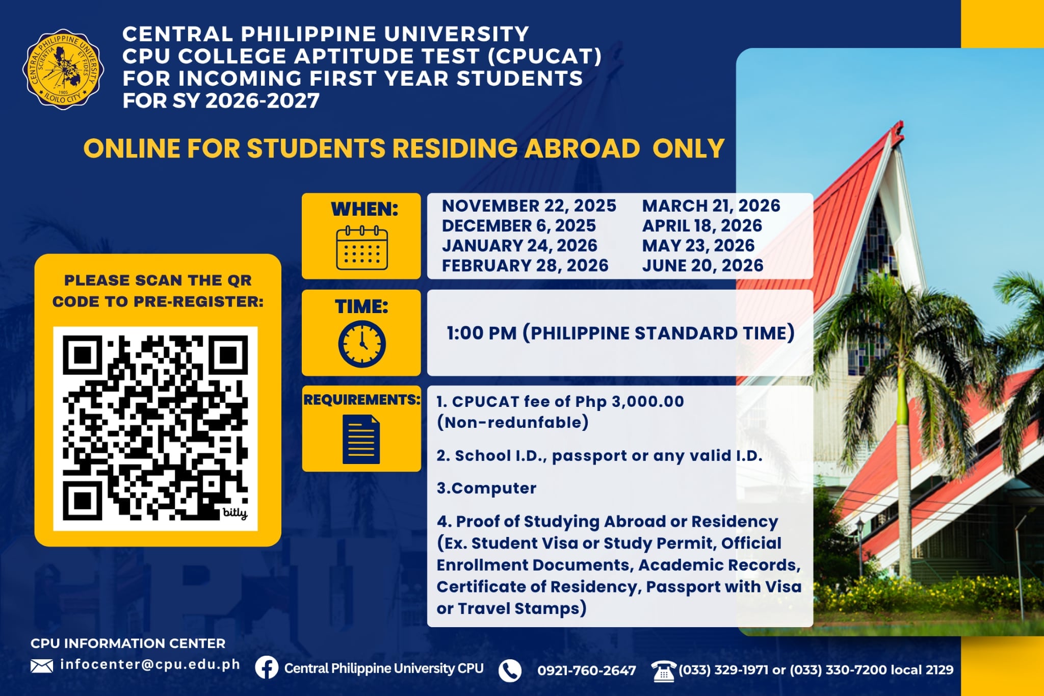 Central Philippine University (CPU) announced that registration is now open for the Online CPU College Aptitude Test (CPUCAT) for incoming first-year students residing abroad for School Year 2026-2027. The announcement was posted on September 3, 2025, through the university’s official Facebook page.