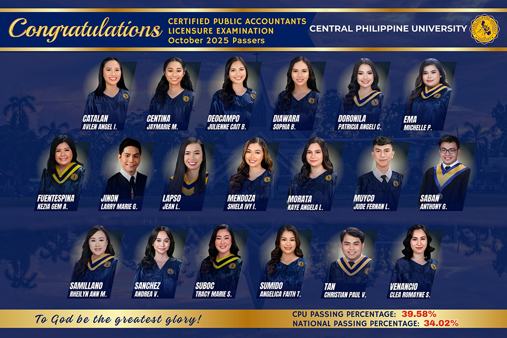 Nineteen (19) Centralians passed the October 2025 Certified Public Accountants Licensure Examination, achieving a passing rate of 39.58%. The results were posted on November 4, 2025, by the Professional Regulation Commission (PRC).