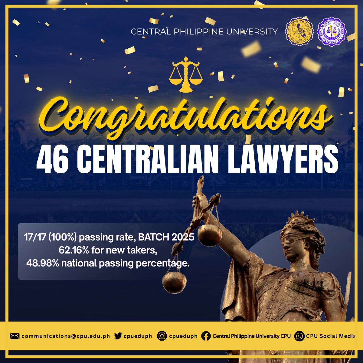 Forty-six graduates of Central Philippine University (CPU) have passed the 2025 Bar Examination, following the Supreme Court of the Philippines’ release of results on Wednesday, January 7, 2026.