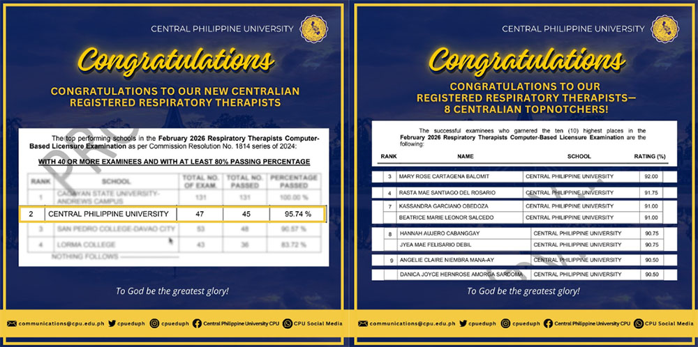 Central Philippine University (CPU) proudly announced that it produced eight Centralian Topnotchers and ranked 2nd among Top Performing Schools in the February 2026 Respiratory Therapists Licensure Examination, achieving a 95.74% passing rate for 40 or more examinees. The announcement was released by the Professional Regulation Commission (PRC) on February 11, 2026.