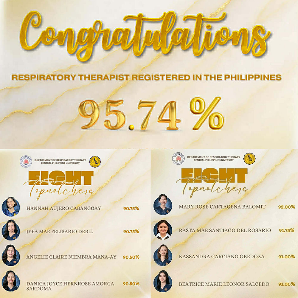 Last February 11, 2026, based on results released by the Professional Regulation Commission (PRC), Central Philippine University achieved an astounding 95.74% passing rate, with 45 out of 47 examinees passing the recently concluded Respiratory Therapists Computer-Based Licensure Exam Board Exam.