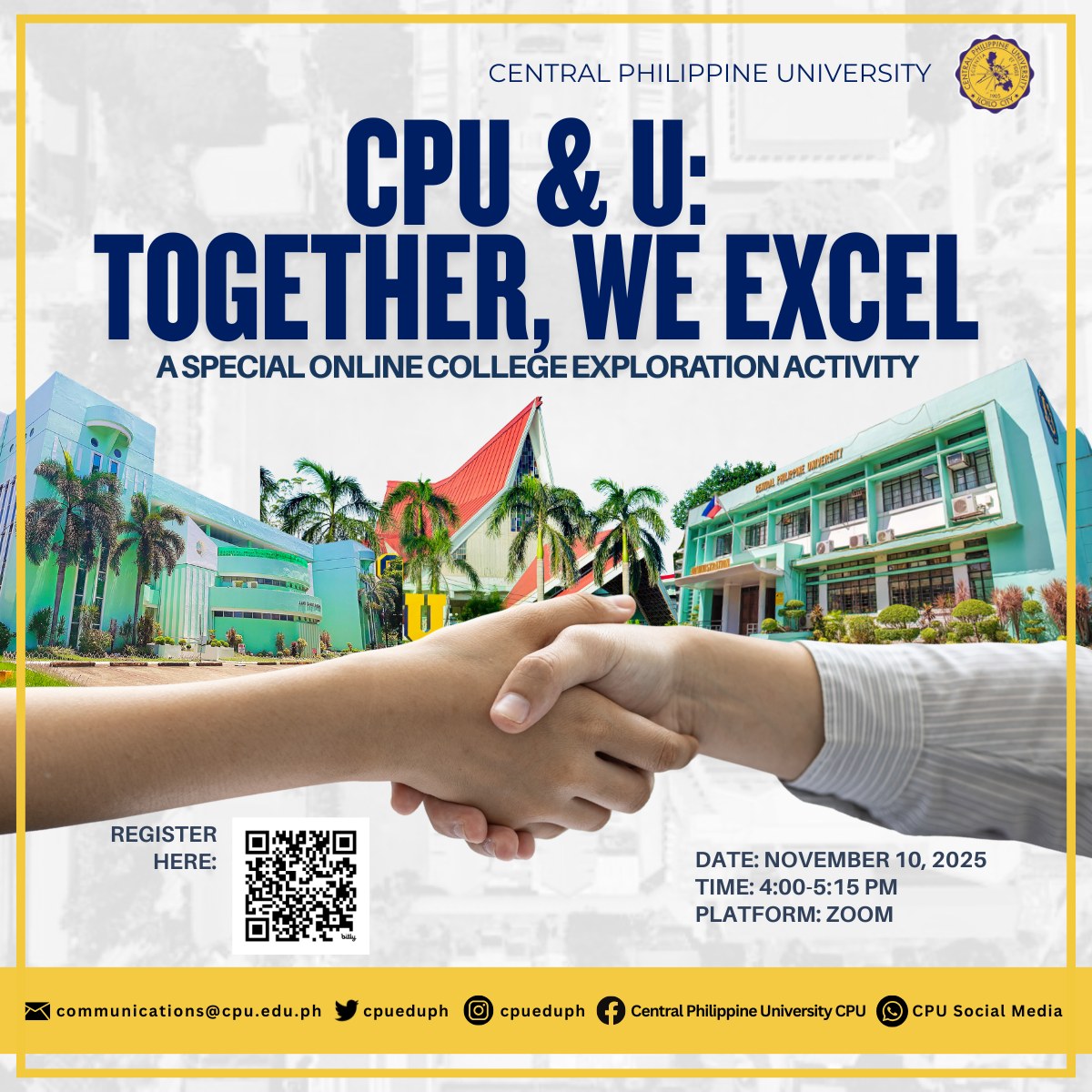 Central Philippine University (CPU) is set to host “CPU & U: Together, We EXCEL!”, a special online college exploration activity designed to engage and inspire Grade 10 to Grade 12 students from both public and private schools across Region VI. The virtual event will be held on November 10, 2025 (Monday), from 4:00 to 5:15 PM via Zoom Teleconferencing.