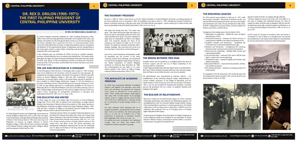 As Central Philippine University celebrates its 120th Founding Anniversary (1905–2025), it looks back with deep gratitude to the leaders who shaped its faith, vision, and identity. Among them, Dr. Rex Divinagracia Drilon stands as a monumental figure, the first Filipino president who transformed CPU from an American-founded mission school into a fully Filipino-led university. His leadership marked a historic turning point: the fulfillment of the long-cherished dream of Filipinization and the strengthening of the Central Spirit, which is a spirit of faith, scholarship, and service that continues to inspire the CPU community today.
