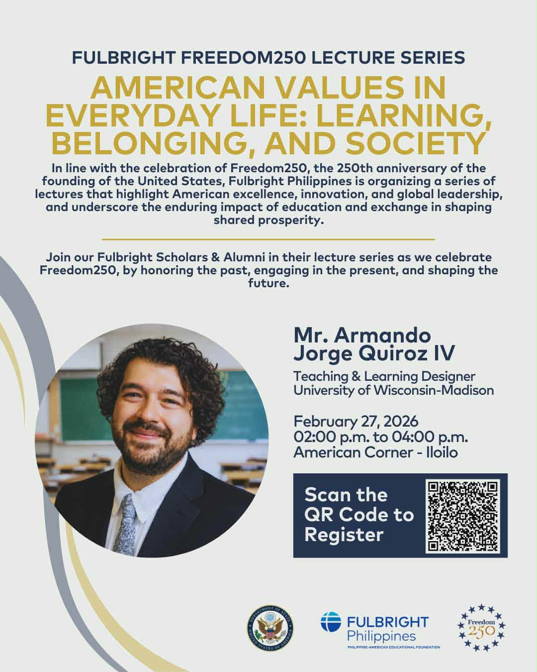 On February 7, 2026, in celebration of the 250th anniversary of the founding of the United States, Fulbright Philippines, in partnership with the American Corner Iloilo, hosted a session of the FULBRIGHT FREEDOM250 Lecture Series at the American Corner, located on the 3rd floor of the Henry Luce III Library at Central Philippine University (CPU).The featured guest lecturer was Mr. Armando Jorge Quiroz IV, a Teaching & Learning Designer from the University of Wisconsin-Madison.