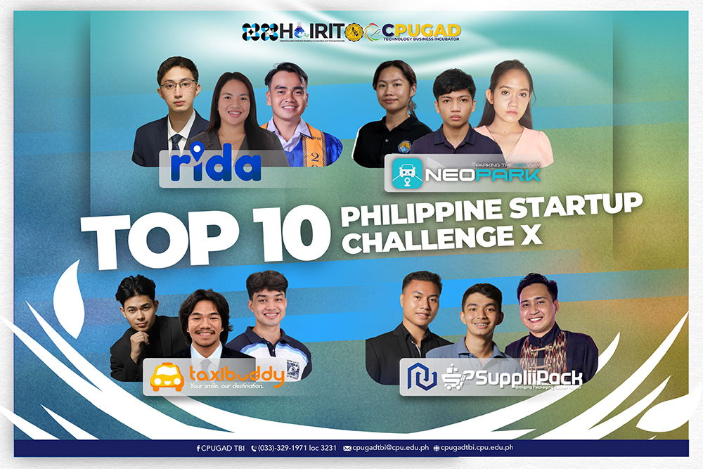 Congratulations to the four CPU CPUGAD TBI startup teams: PackUp, TaxiBuddy, RidA, and OHMies NeoPark for advancing to the Top 10 of DICT’s Philippine Startup Challenge X Regional Pitching Competition. To God be the highest glory!