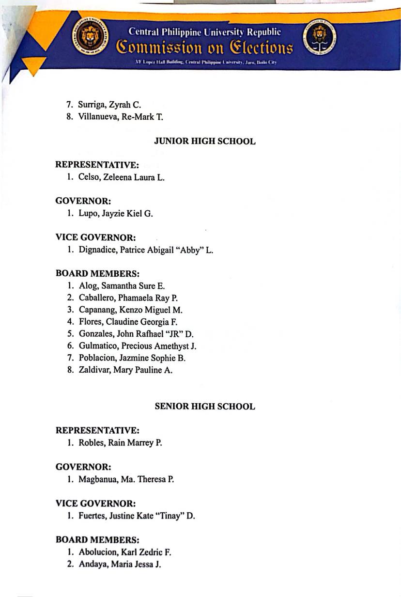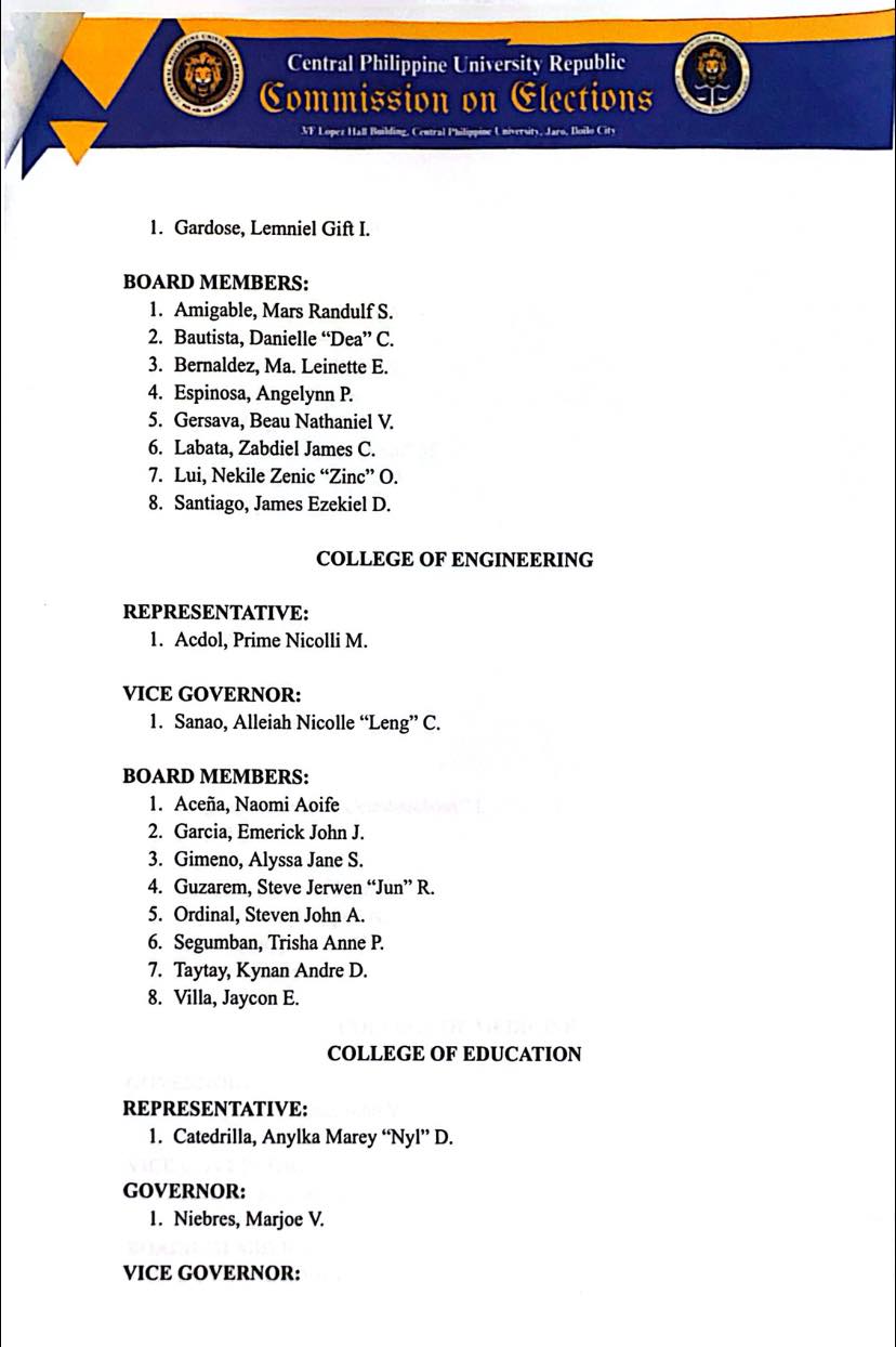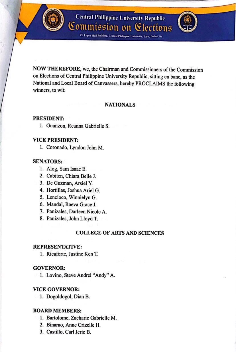 Below is the official list of winners of the March 27, 2026, CPUR Elections as proclaimed by the CPUR Commission on Elections: