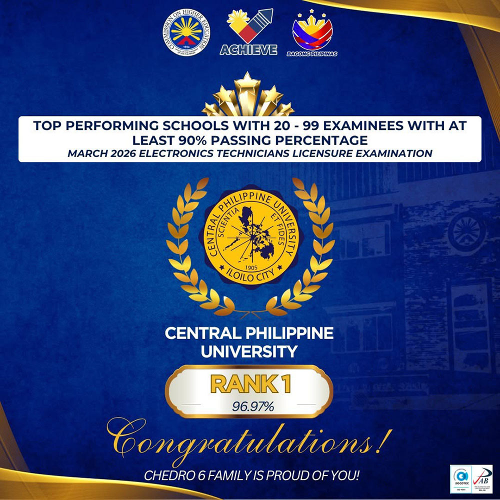 Central Philippine University (CPU) has once again brought pride and honor to the Centralian community after emerging as the Top 1 Performing School nationwide in the March 2026 Electronics Technicians Licensure Examination.