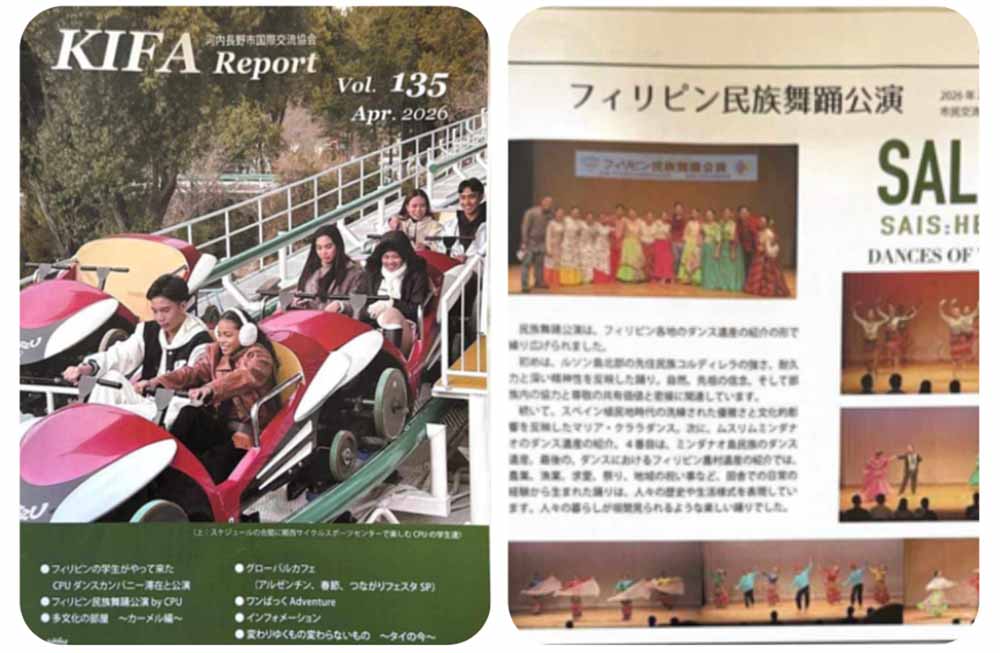 The Central Philippine University (CPU) Tumandok Dance Company is featured in the April 2026 issue of the KIFA Report Magazine Vol. 135, published by the Kawachinagano City International Association (KIFA).